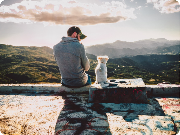 Illustrated picture of an elder man with white hair and glasses with a brown dog on his lap.